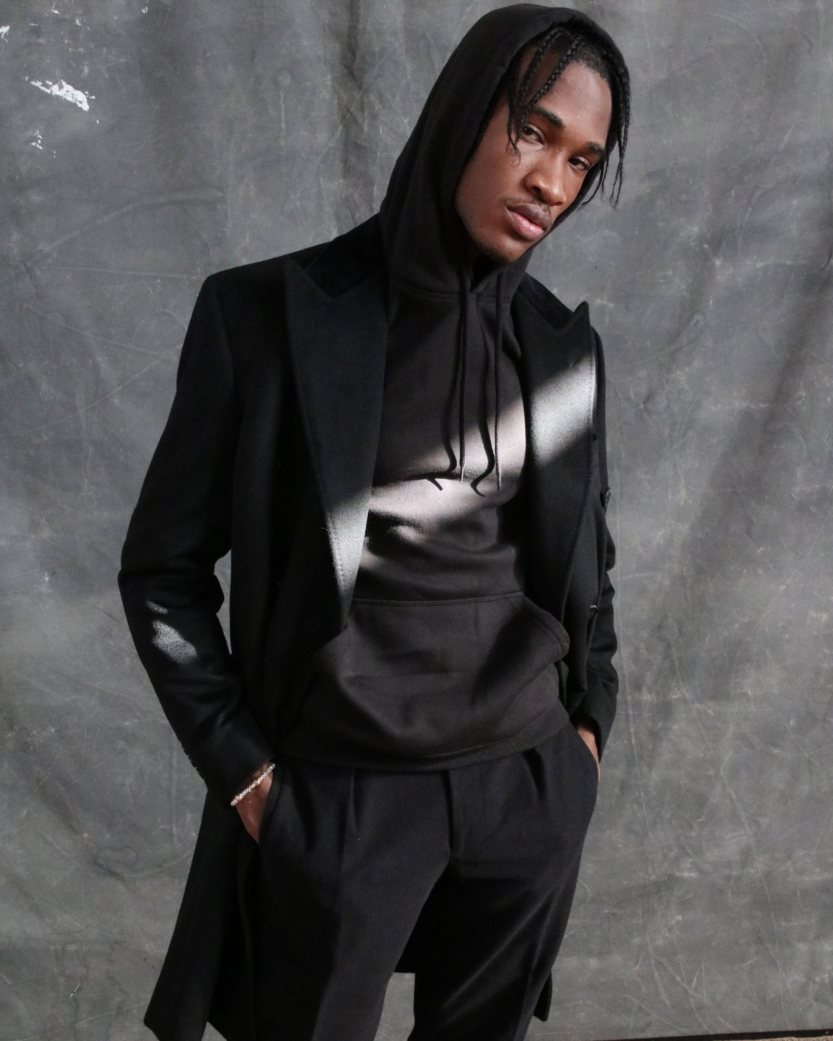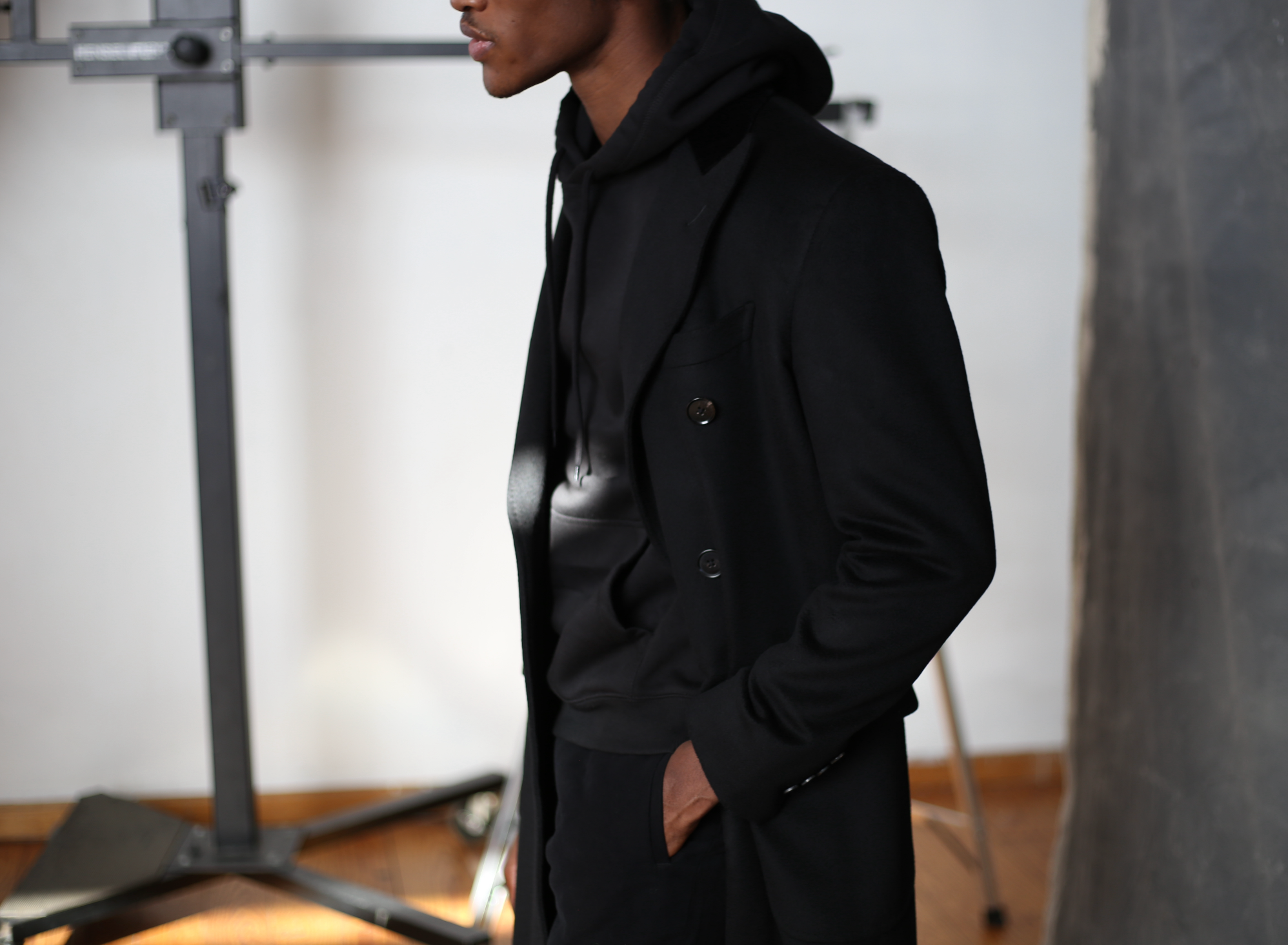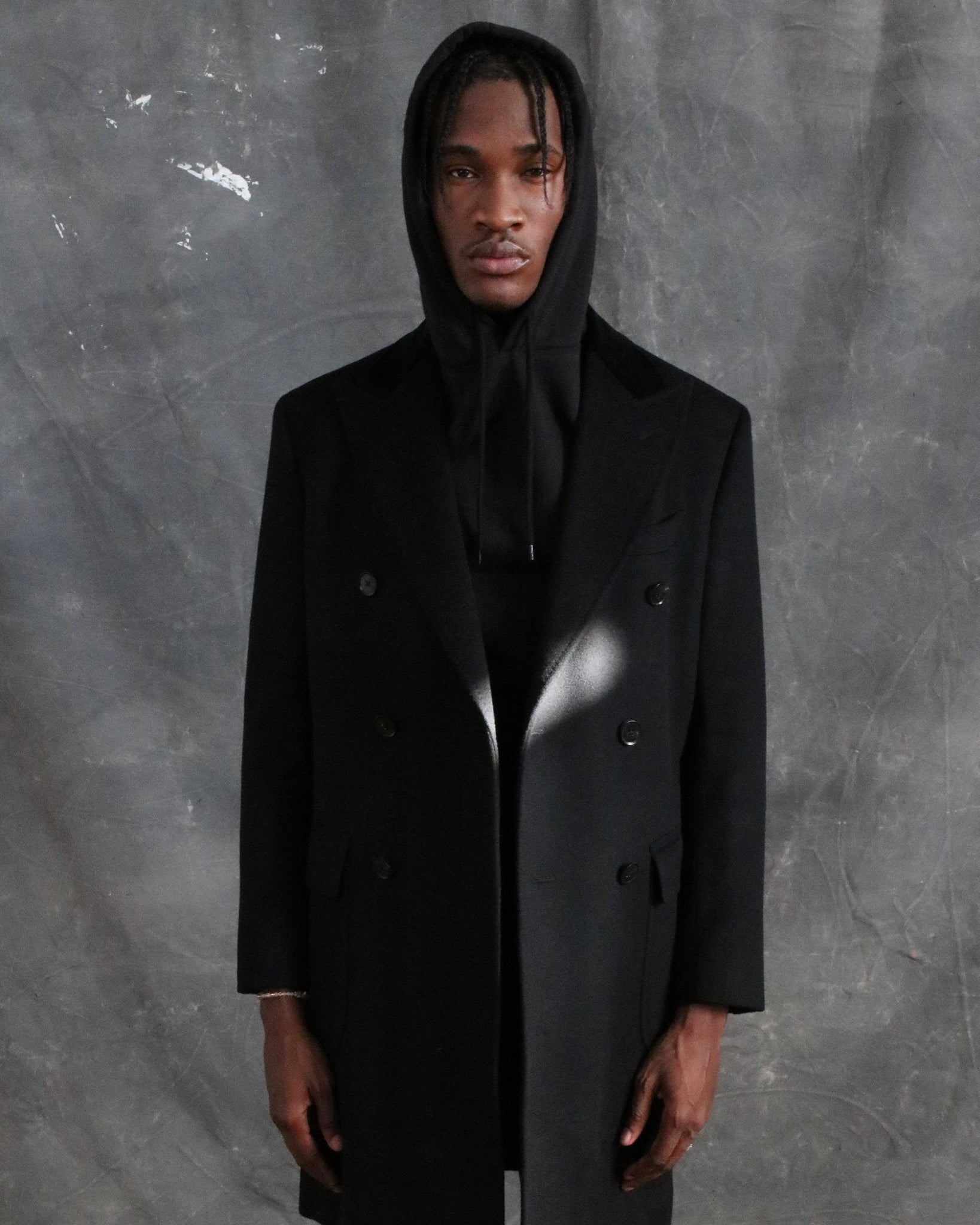 Expertly crafted in Italy using a blend of 10% cashmere and 90% wool cloth, this Black Double Breasted Chesterfield Overcoat features a banana welt center vent, patch flap pockets, and a black velvet back collar. With natural dark horn buttons and functioning button holes, this overcoat is finished with a full canvas, natural light rope shoulder, and black silk lining.